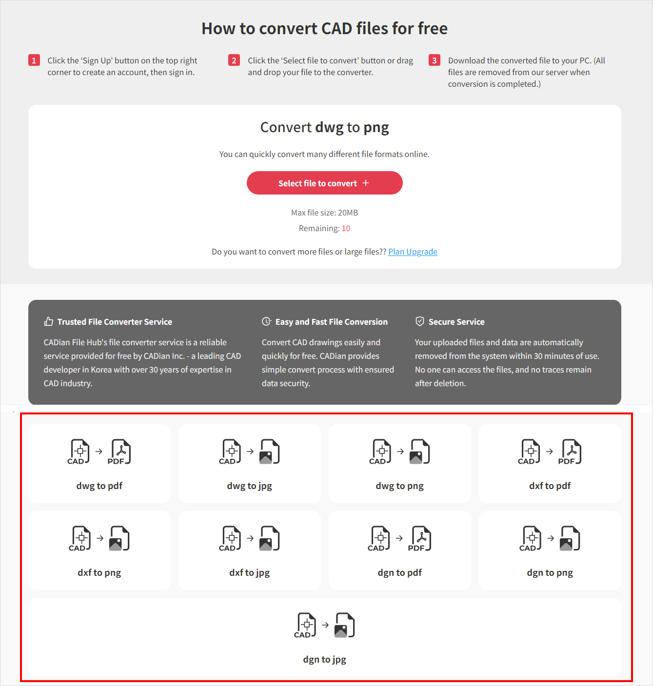 Scroll down from the Converter page and select the file types you want to convert. (Default: dwg → png)