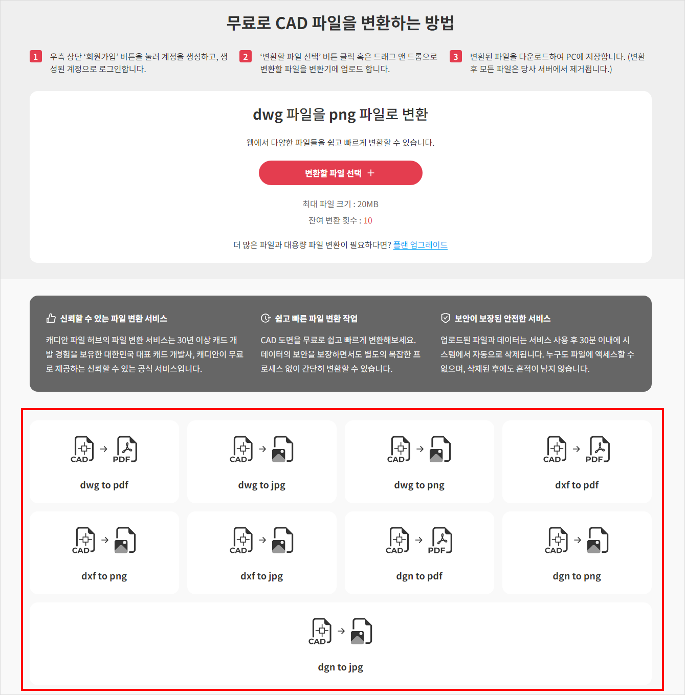 무료 사용자의 경우 한 번에 업로드할 수 있는 파일의 최대 용량은 20MB 이며, 파일은 하루에 최대 10개까지 변환할 수 있습니다.